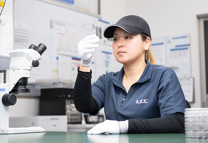 現在は検査員として、製造工程から流れてくる製品をチェックしています。不良品を見逃さず、お客様のもとへ不良が流出しないようにすることが私たちの役割です。